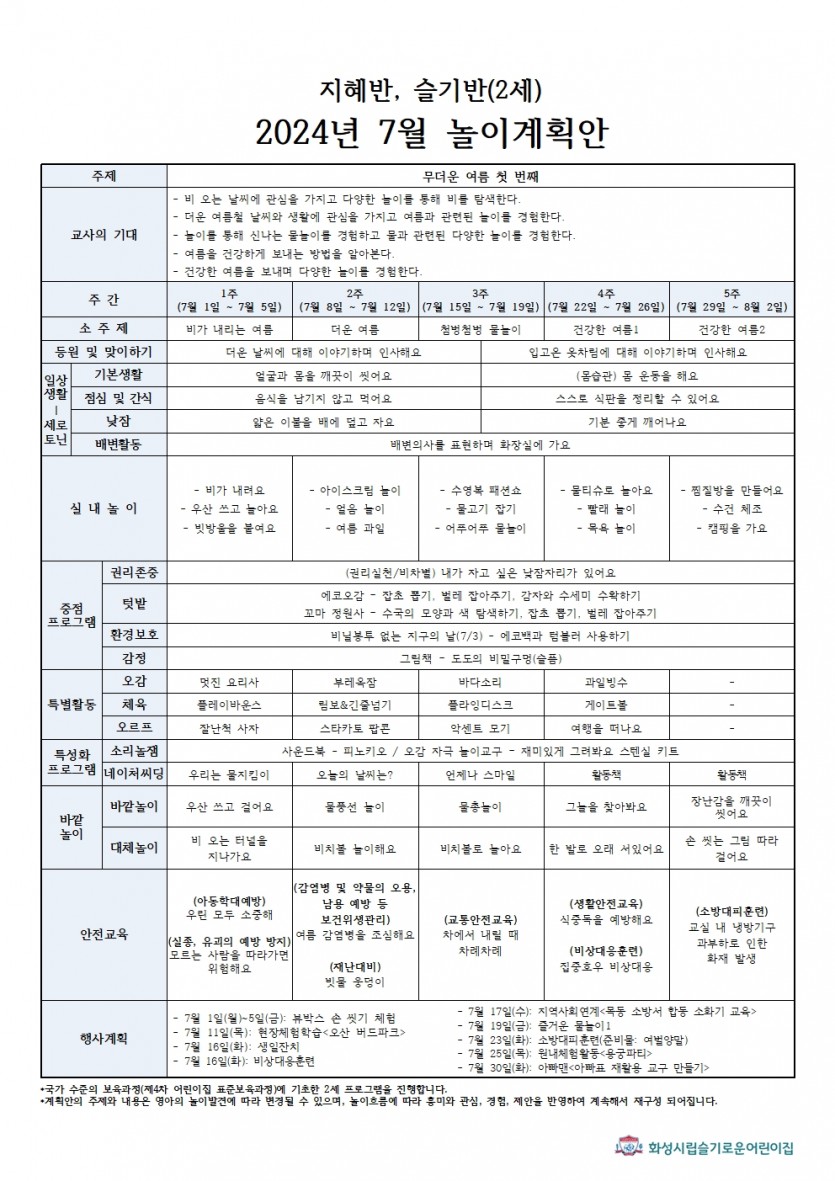 어린이집 화성시립슬기로운어린이집 7월 놀이계획안 페이지 정보 작성자 김다희 댓글 0건 조회 1,291회 작성일 24-06-28 16:39 목록 본문 이전글[시립은계파크자이어린이집]지역사회연계활동-엠버버스 24.06.28 다음글화성시립슬기로운어린이집 7월 식단표 24.06.28 댓글 0 댓글목록 등록된 댓글이 없습니다.